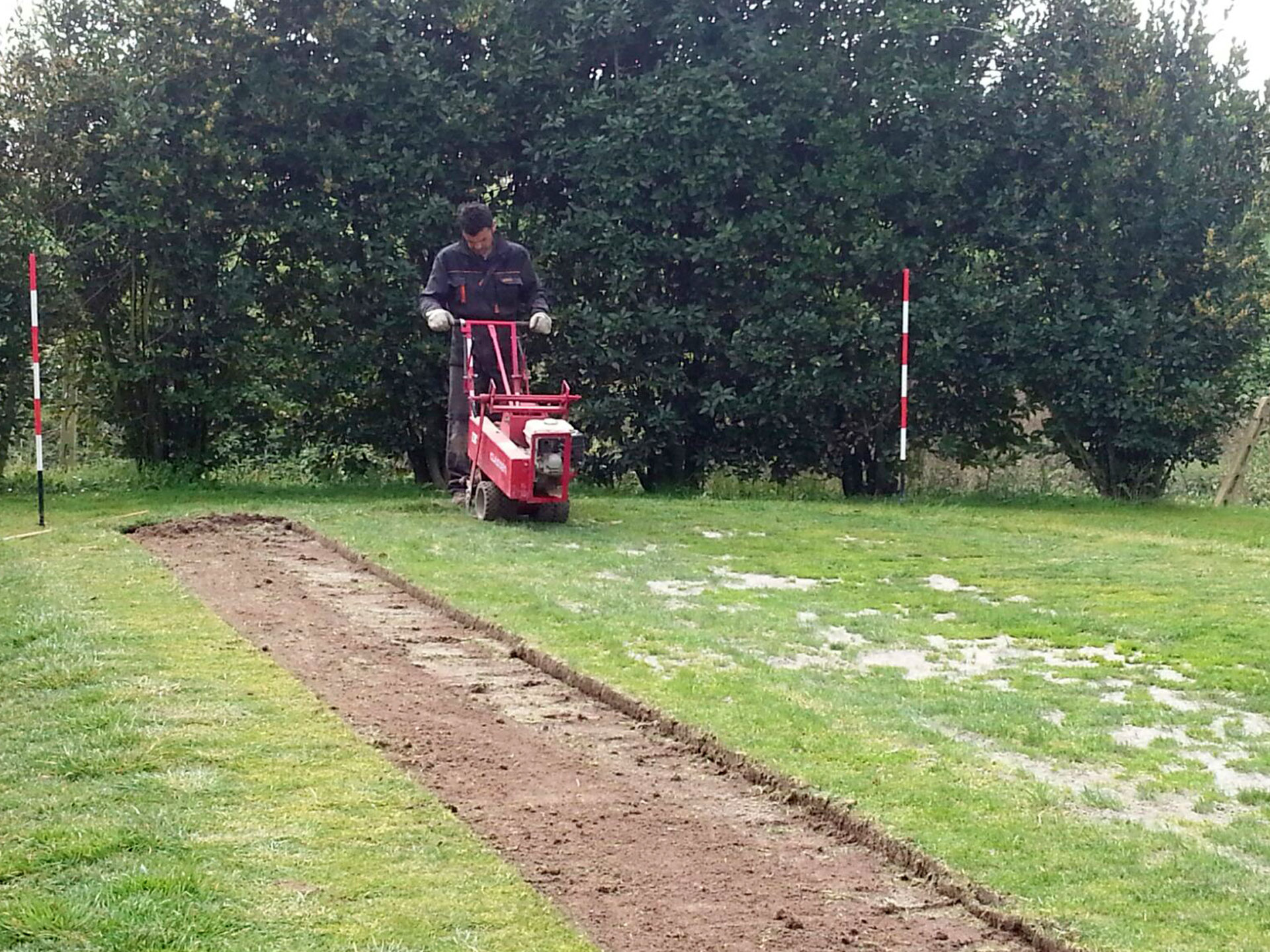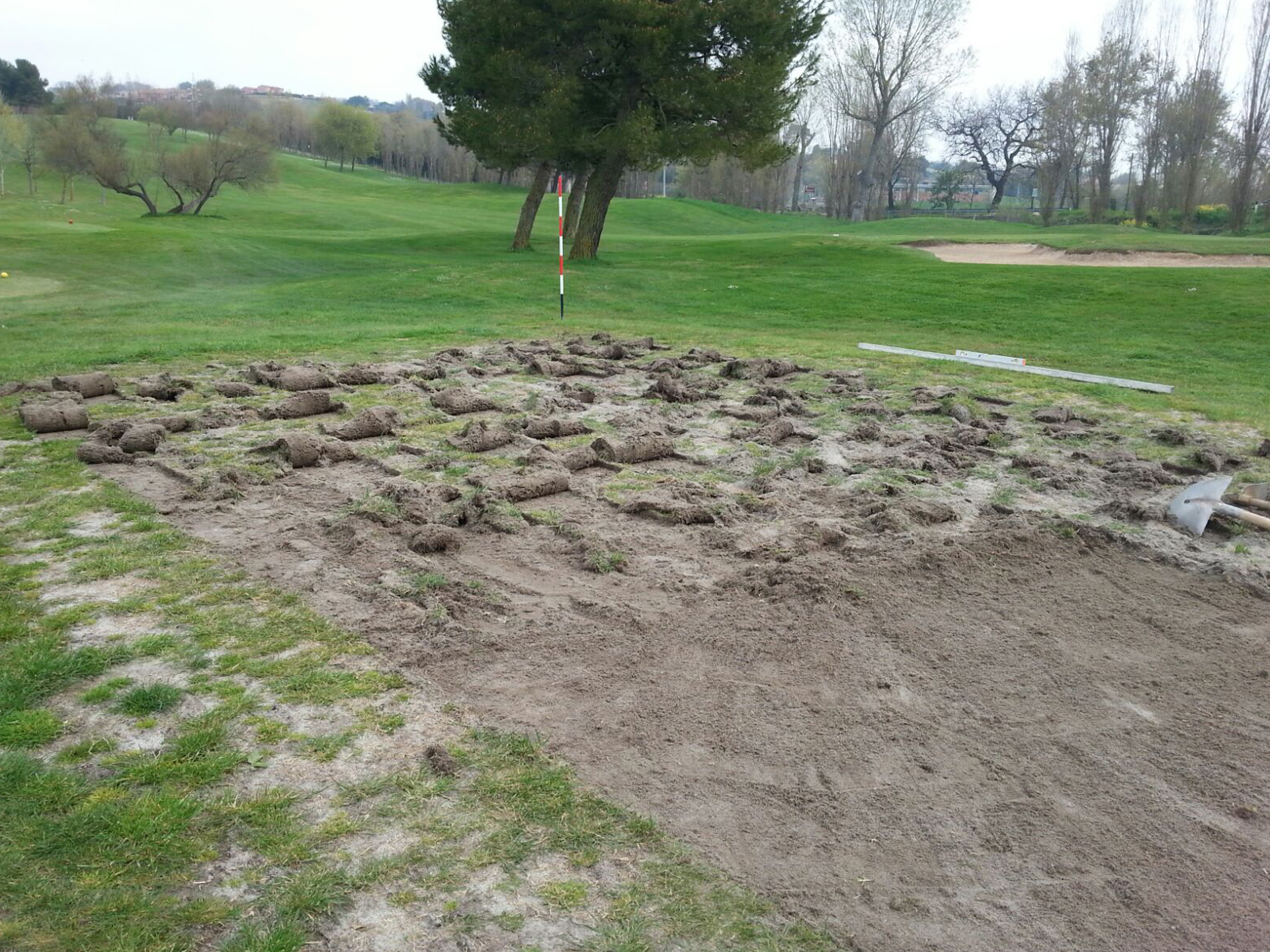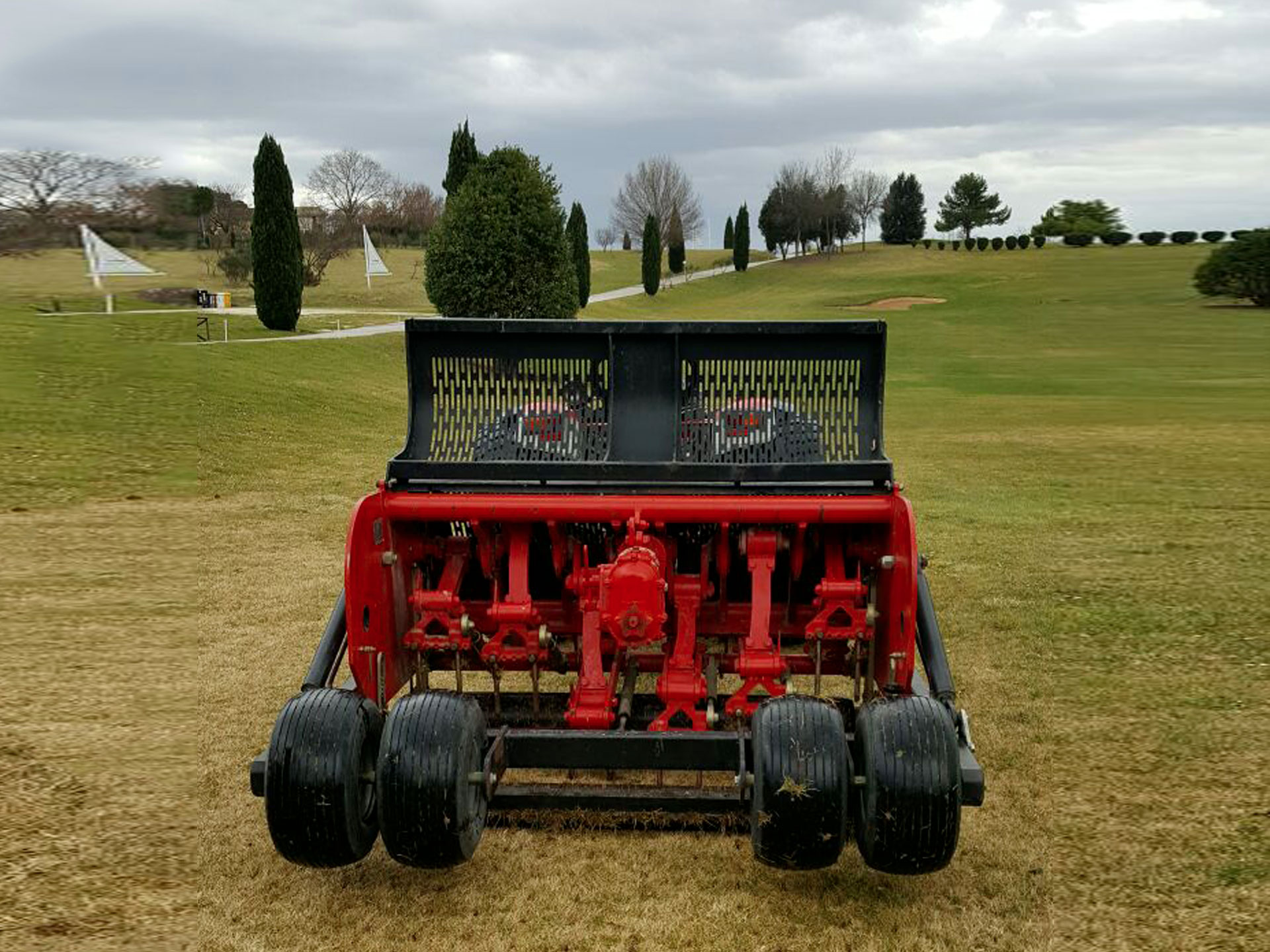 Scotico del tappeto erboso del Tee di gioco con macchina zollatrice e preparazione del Topsoil presso Campo da Golf -