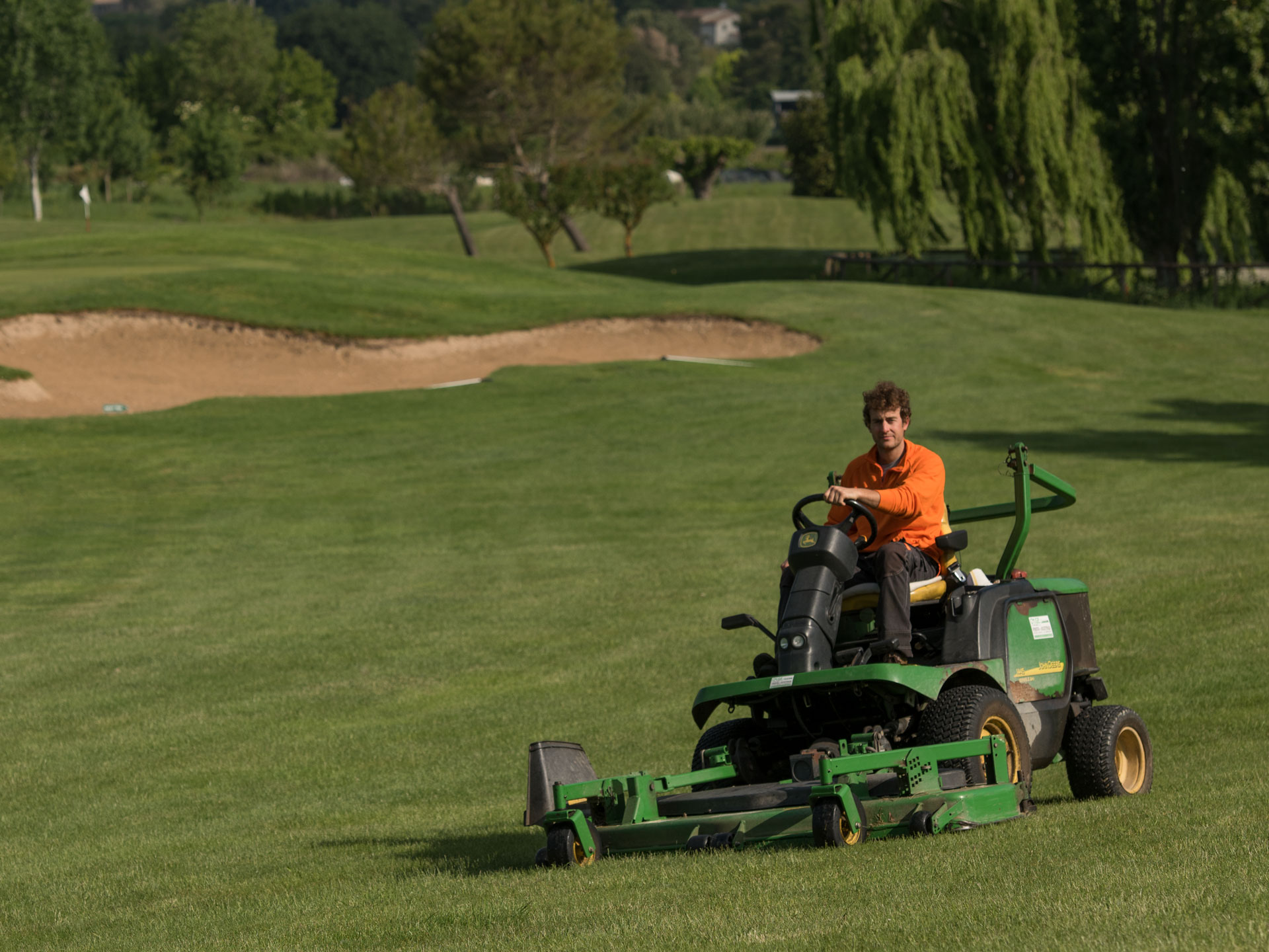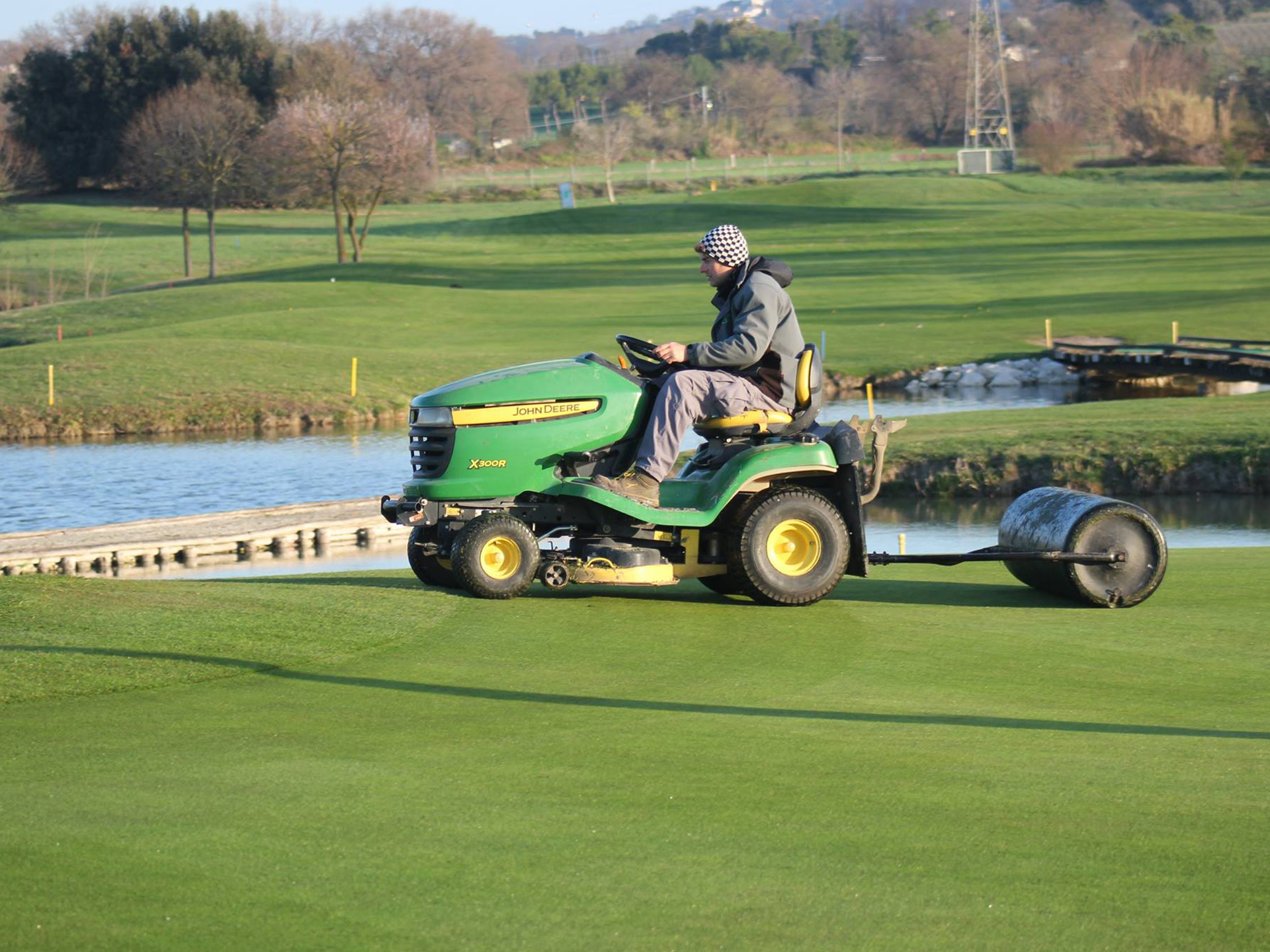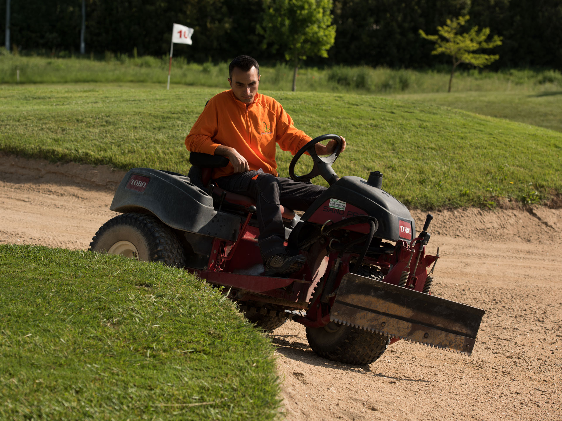 Scotico del tappeto erboso del Tee di gioco con macchina zollatrice e preparazione del Topsoil presso Campo da Golf -